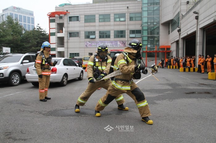 서울 동작소방서는 25일 오전 9시 소방서 뒤꼍에서 2016년 소방기술경연대회를 대비해 화재진압 4인조법 훈련을 실시했다. 사진은 대회에 출전하는 관계자들이 수관 전개 훈련을 하는 모습.(사진제공=동작소방서)