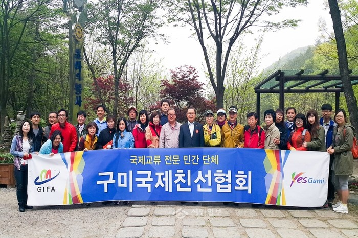 지난 23일 경북 구미국제친선협회는 천생산에서 회원 50여명이 참석한 가운데 회원단합 등반대회를 개최했다. 사진은 행사에 참석한 남유진 시장(가운데)과 관계자들이 기념촬영을 하는 모습.(사진제공=구미시청)