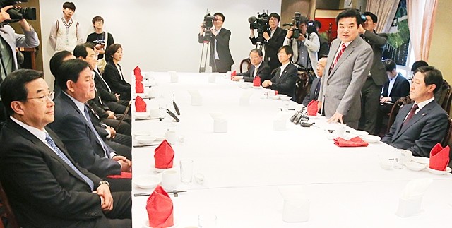새누리당 대표 권한대행인 원유철 원내대표가 25일 오후 서울 여의도의 한 중식당에서 열린 4선이상 중진의원 오찬에서 인사말을 하고 있다. 이날 모임에는 최경환, 정갑윤, 이주영 ,나경원 의원 등이 참석해 총선 참패 이후 당 수습과 차기 원내대표 선출 등을 논의했다.
