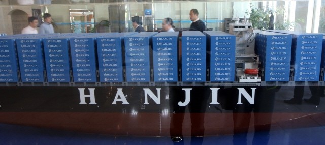 25일 오전 서울 여의도 한진해운 본사 로비에서 직원들이 대형 선박 조형물 앞을 지나고 있다.이날 금융당국은 최은영 유수홀딩스 회장 일가가 자율협약 신청 발표 직전 한진해운 주식을 처분한 것을 두고 조사에 착수했다고 발표했다.