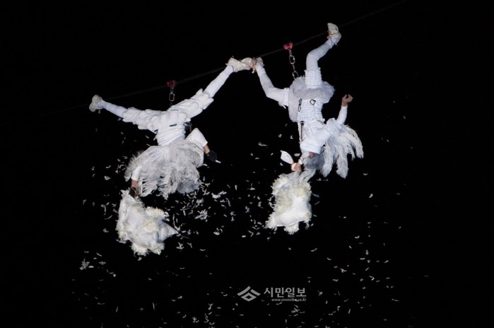 | ▲ 이번 축제 개막작으로 예정된 '천사의 광장'에서 배우들이 깃털 퍼포먼스를 선보이고 있다. | ||