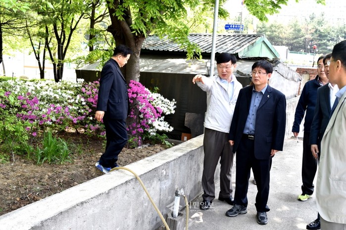 김성환 서울 노원구청장(왼쪽에서 세 번째)이 지난 25일 오전 11시 주민참여예산 사업인 중현어린이공원 보수공사 관련 현장을 방문해 공원시설을 둘러보고 있다.(사진제공=노원구청)