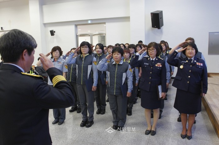 지난 25일 인천 중부소방서는 영흥도에 위치한 늘푸른센터에서 영흥도 지역안전을 위해 김성애 의용소방대장 등 30명으로 구성된 영흥여성의용소방대 발대식을 개최했다. 사진은 의용소방대원들이 김문원 서장에게 경례하는 모습.(사진제공=인천중부소방서)