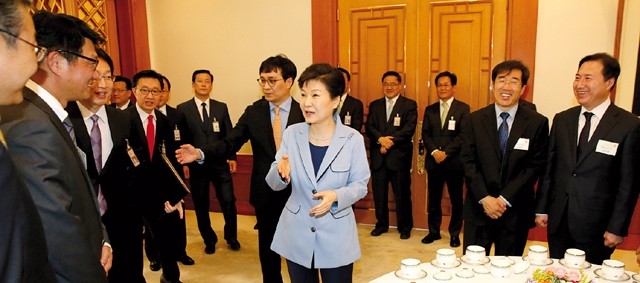 박근혜 대통령이 26일 낮 청와대에서 중앙언론사 편집·보도국장 오찬 간담회에 참석,참석자들과 대화하고 있다.