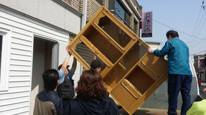 지난 25일 경기 동두천시 중앙동 지역사회보장협의체는 홀몸노인 가정을 방문해 이삿짐을 나르는 봉사활동을 전개했다. 사진은 협의체 관계자들이 옷장을 나르는 모습.(사진제공=동두천시청)