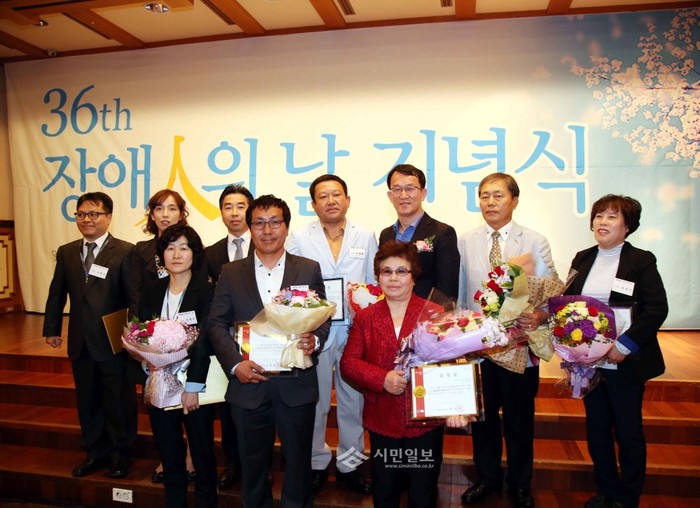 26일 경기 용인시는 에버랜드 캐빈호스텔에서 제36회 장애인의 날 기념행사를 개최하고 모범장애인과 장애인복지증진을 위해 헌신해 온 자원봉사자 및 후원자 등 50명을 표창했다. 사진은 조청식 부시장(뒷줄 오른쪽에서 세번째)과 수상자들이 기념촬영하는 모습.(사진제공=용인시청)