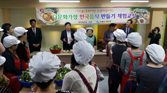 지난 25일 경기 수원시 권선구는 세류1동 다문화사랑방에서 다문화가족과 함께 하는 한국 음식 만들기 체험교실을 개최했다. 사진은 행사에 참석한 박흥수 구청장(앞줄 왼쪽에서 두번째)이 인사말을 하는 모습.(사진제공=권선구청)