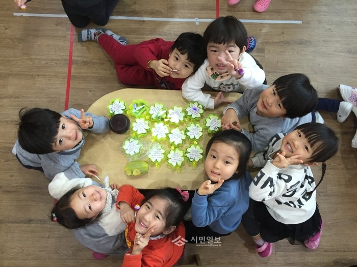 재단은 사회적 새싹나눔 교육을 진행했다. 아이들에게 동화 <기다란 숟가락>을 들려주고 뽀로로 나눔퀴즈로 아이들이 답을 찾도록 교육을 진행하며 나눔씨앗을 심었다. 나눔은 어려운 것이 아니라 약하고 장애가 있는 친구의 두 손을 꼭 잡고 같이 함께 걸어가는 일, 넘어진 친구 도와주기, 사이좋게 음식 나눠먹기 등 가까운 곳에 우리의 실천에 있다는 것을 강조했다.