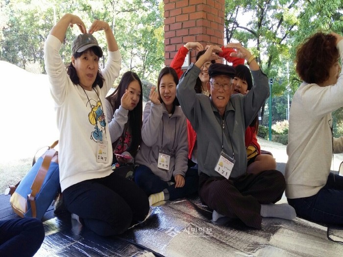 | ▲ 북부노인프로그램에 참여한 참가자들이 하트를 그리며 기념촬영을 하고 있다. | ||