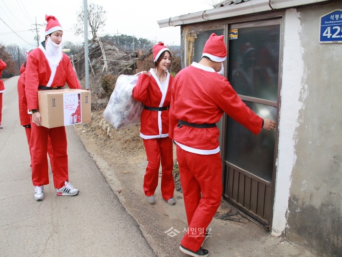 | ▲ 김포 복지재단이 어려운 이웃을 돕기 위해 실시한 희망 꾸러미 사업 참가자들이 산타복장을 하고 물품을 전달하기 위해 한 가정을 방문하고 있다. | ||
