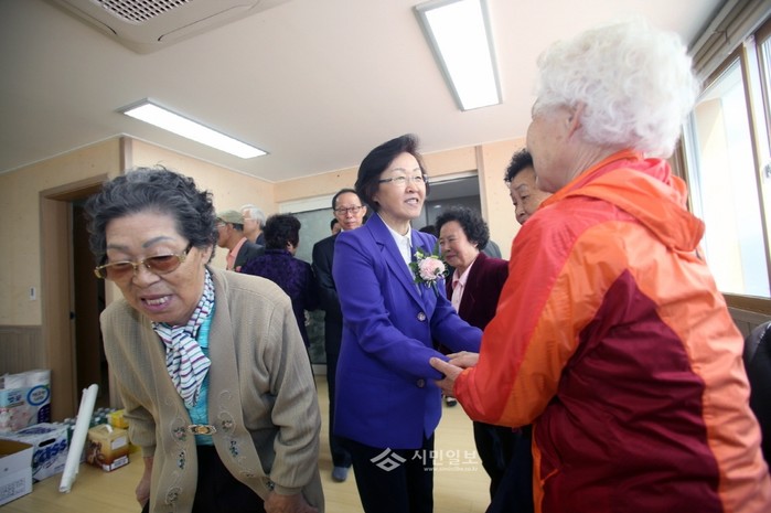 신연희 강남구청장(가운데)이 지난 26일 오전 11시 강남구 세곡동에서 열린 ‘윗반 마을 경로당 개관식’에 참석해 노인들과 인사를 나누고 있다.(사진제공=강남구청)