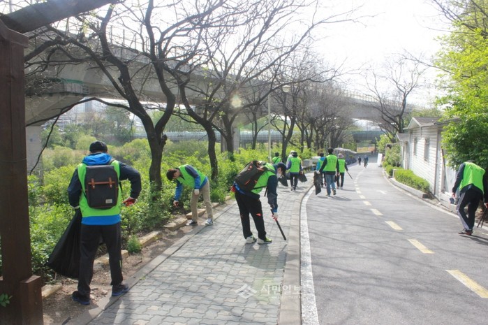 지난 24일 성동구도시관리공단은 임직원 26명이 참여한 가운데 청계천 수변을 중심으로 약 3km에 이르는 시설관리공단 사거리부터 사근 삼거리 산책로와 도로변에서 '봄맞이 청계천 대청소'를 실시했다. 사진은 참가자들이 도로변을 청소하는 모습.(사진제공=성동구도시관리공단)