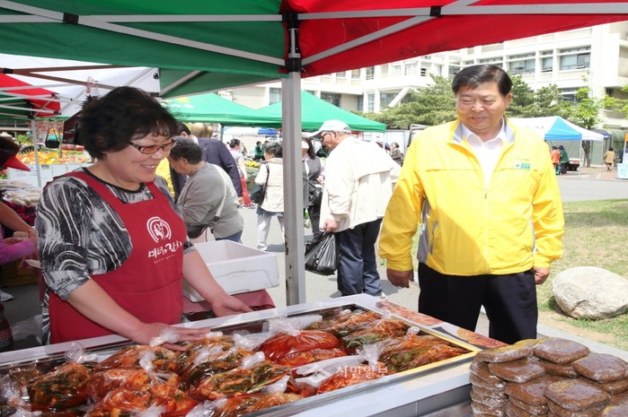 조길형 영등포구청장(오른쪽)이 지난 26일 영등포구청 광장에서 열린 '농수축산물 직거래장터'를 찾아 다양한 종류의 김치를 판매하는 상인과 이야기를 나누고 있다.(사진제공=영등포구청)