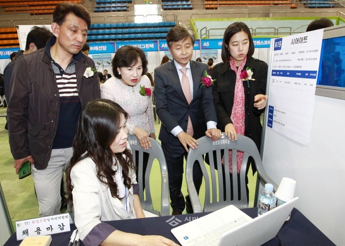 지난 26일 나상성 경기 광명시의회 의장(오른쪽에서 두번째)과 시의원들은 광명시민체육관에서 열린 '2016 희망드림 일자리 박람회'에 참석해 관계자들을 격려하고 참가 기업들을 방문하는 시찰활동을 실시했다.(사진제공=광명시의회)