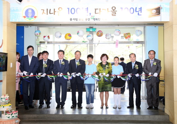 지난 26일 서울 마포구 대흥동 소재 용강초등학교에서 100주년 기념행사가 열린 가운데 박홍섭 마포구청장(오른쪽에서 두번째)이 문명근 서울 서부교육지원청 교육장(왼쪽에서 세번째) 및 관계자 등과 함께 '학교 역사 기념관' 개관 테이프커팅을 하고 있다.(사진제공=마포구청)