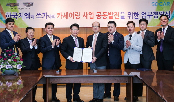 한국지엠과 쏘카는 28일 서울 역삼동 특판본부에서 한국지엠 국내영업본부 이상호 상무, 쏘카 사업본부 임영기 본부장 등 관계자가 참석한 가운데 업무 협약서에 서명하고 사업 활성화를 통한 동반 성장에 뜻을 모았다고 밝혔다.