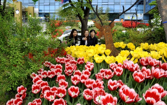 지난 27일 서대문구청 광장에 형형색색의 아름다운 튤립이 만개한 가운데 구청 직원들이 점심 휴식시간을 이용해 구청 광장에 활짝 핀 튤립을 감상하고 있다.(사진제공=서대문구청)