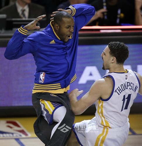 | ▲ 클레이 톰슨과 안드레이 이궈달라가 환호하고 있다. /AP=연합뉴스 | ||