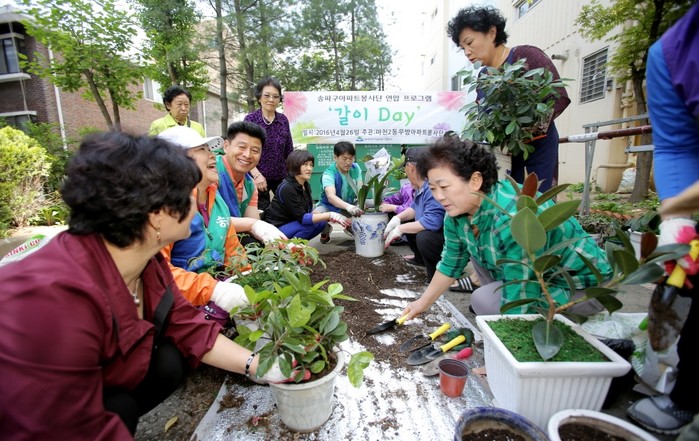 지난 26~27일 서울 송파구는 아파트연합봉사단이 지역내 4개 아파트 단지를 돌며 ‘화초 분갈이 봉사 및 경로당 화분 기증 행사’를 진행했다. 사진은 지난 26일 봉사단이 마천2동우방아파트를 방문해 분갈이를 시연하는 모습.(사진제공=송파구청)