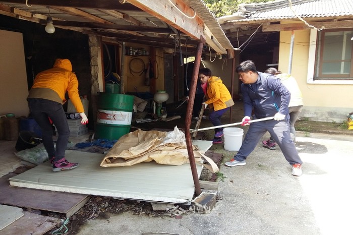 전남 진도군 군내면에서 지역 체육회원들과 공직자들이 조손가정의 집을 방문, 집 청소 등을 통해 봉사를 실천했다. 사진은 이날 봉사활동에 참석한 관계자들이 청소하는 모습.(사진제공=진도군청)