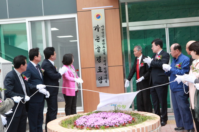 지난 27일 경기 수원시 권선구는 세류동 가는골 경로당 개소식을 개최했다. 사진은 박흥수 구청장(오른쪽에서 네 번째) 및 관계자들이 현판 개막식을 진행하는 모습.(사진제공=권선구청)