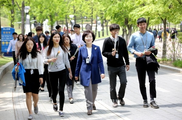 최근 박춘희 서울 송파구청장(가운데)가 새내기 공무원들의 공직생활 1주년을 축하하기 위해 ‘구청장과 함께하는 새내기 공무원 데이트’를 실시했다. 사진은 박 구청장이 공무원들과 함께 산책을 하고 있는 모습.(사진제공=송파구청)