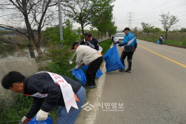 최근 경기 화성시 향남읍사무소는 오는 5월21일 화성종합경기타운에서 개최되는 '제17회 화성 효 마라톤 대회'를 앞두고 민·관 합동으로 손님맞이 대청소를 실시했다. 사진은 행사 참가자들이 도로변을 청소하는 모습.(사진제공=화성시청)