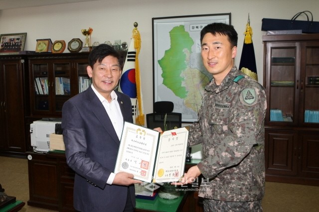 [시민일보=고수현 기자]서울 강북구의회 김동식 의장이 최근 의장실에서 활발한 의정활동 및 통합방위태세 확립에 기여한 공로를 인정받아 56사단으로부터 감사장과 감사패를 수여 받았다.