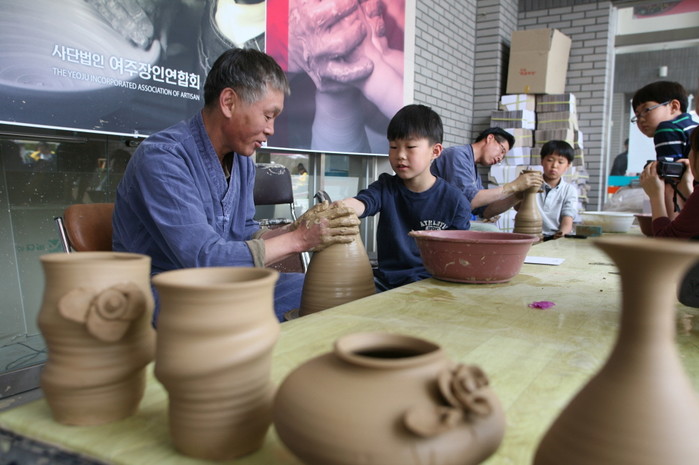 | ▲ '여주도자기축제'의 '나만의 도자기 만들기' 프로그램에 참석한 어린이가 도예가와 함께 도자기를 빚고 있다. | ||