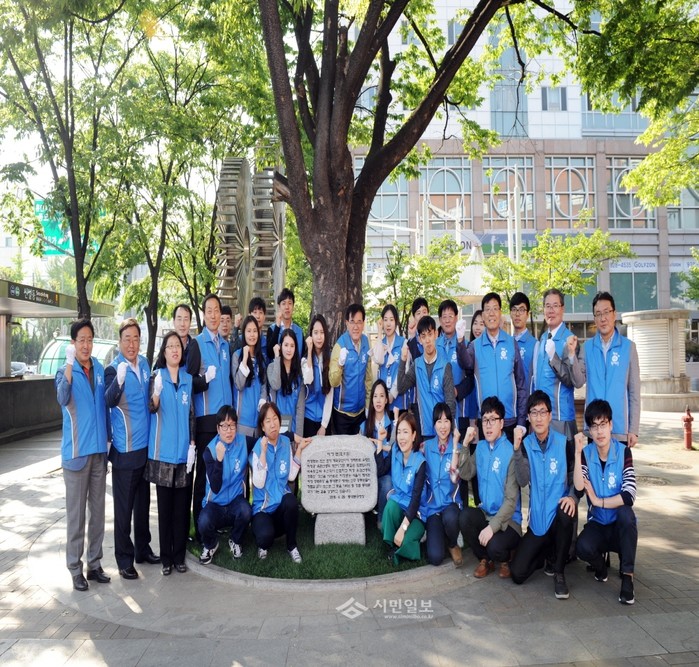 최근 동대문구는 하정로(동광 동대문베르빌 광장)에서 신규직원 등 30여명과 함께 '하정로 안내판·표지석 설치 기념식'을 개최하고 ‘청렴길 걷기 행사’를 실시했다. 사진은 유덕열 구청장(가운데)과 구청 직원들이 기념촬영하는 모습.(사진제공=동대문구청)