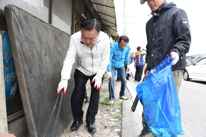 최근 경기 양주시는 남방2통 지역경제 활성화 및 일자리 창출을 위한 양주시사회적경제협의회와의 상호협력 업무협약을 체결하고 남방2통 마을대청소를 실시했다. 사진은 청소에 동참한 이성호 시장(왼쪽)이 쓰레기를 수거하는 모습.(사진제공=양주시청)