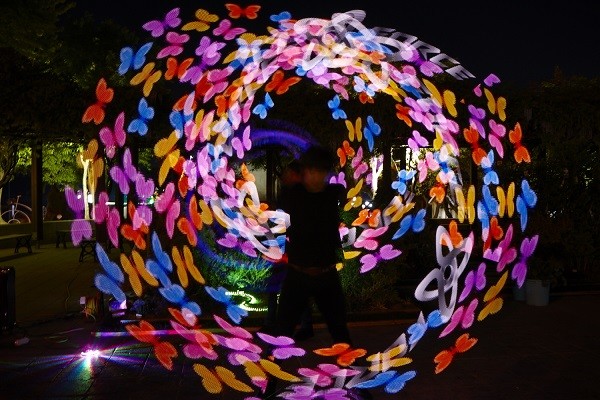 ▲ 사진제공=고양시청/사진설명: 야간 개장한 꽃박람회장에서 ‘LED 마샬아트’ 공연이 펼쳐지고 있는 모습.
