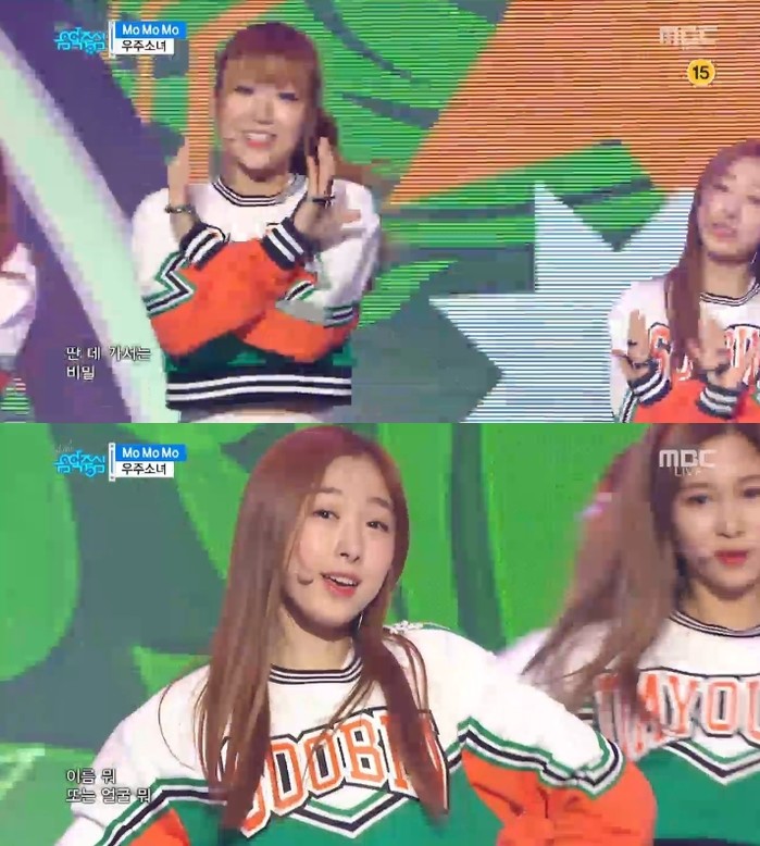 이날 우주소녀는 캐주얼한 맨투맨 티셔츠에 화이트 스커트를 입고 무대에 올랐다. 이들은 칼군무를 소화해냄은 물론, 상큼 발랄한 표정으로 시선을 사로잡았다.