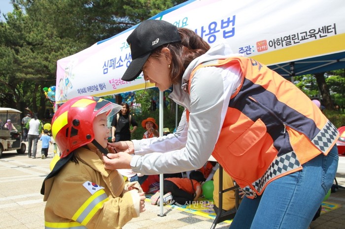 지난 5일 구로소방서는 고척2동에 위치한 고척근린공원에서 '찾아가는 119안전체험' 코너를 운영했다. 사진은 소방서 관계자가 어린이에게 소방안전모를 씌우는 모습.(사진제공=구로소방서)