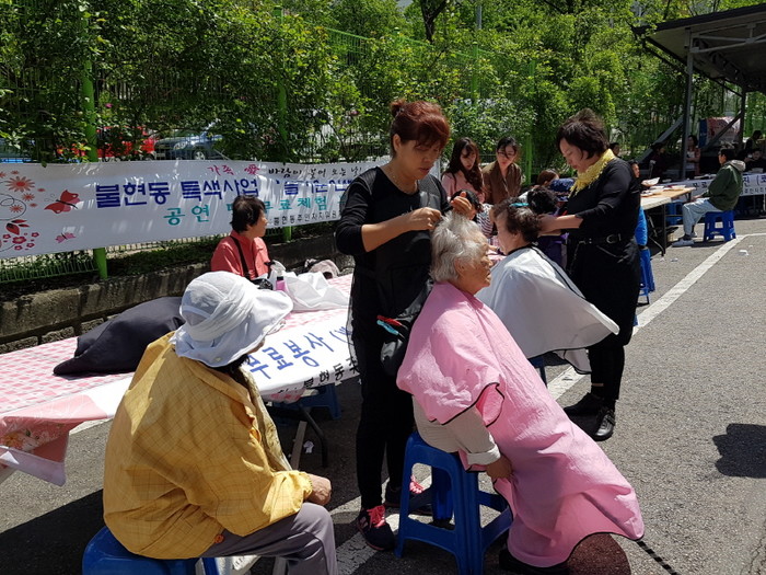 최근 경기 동두천시 불현동 주민자치위원회에서는 2016년 불현동 특색사업인 '즐거운 인생, 백세까지'와 관련, 노인을 위한 체험부스를 운영했다. 사진은 행사에 참석한 관계자들이 노인들의 머리를 손질하는 모습.(사진제공=동두천시청)