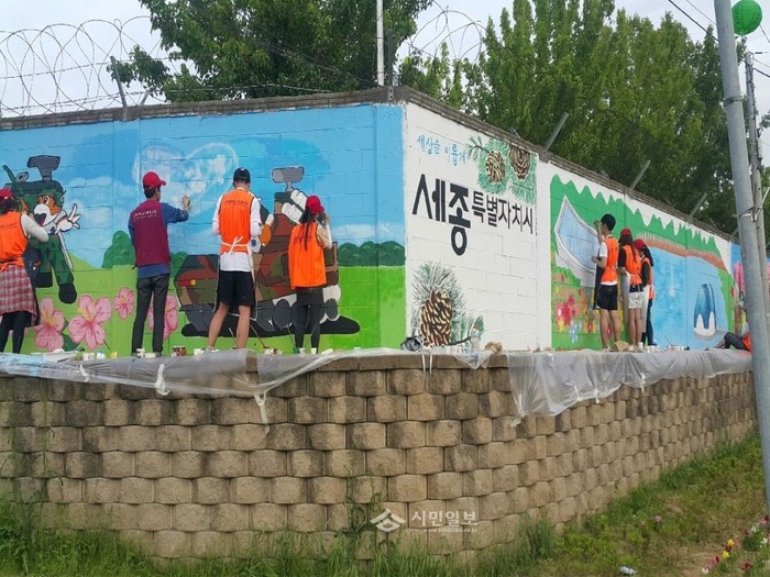최근 세종시 연기면과 육군방공학교, 세종시자원봉사센터의 공동 주관 아래 고려대세종캠퍼스 사회봉사단이 재능기부를 통해 육군방공학교가 위치하고 있는 연기면 보통리 마을길을 새롭게 만들었다. 사진은 자원봉사자들이 벽화를 그리고 있는 모습.(사진제공=세종시청)