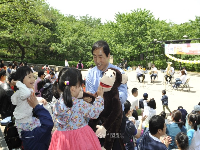 최근 서울 서대문구는 어린이날을 맞아 홍제천 변에서 '2016 서대문구 어린이축제'를 개최했다. 사진은 문석진 구청장이 축제에 참석해 안산 벚꽃마당에서 원숭이 인형을 들고 어린이들과 놀아 주고 있는 모습.(사진제공=서대문구청)
