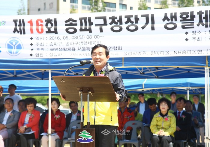 지난 8일 임춘대 서울 송파구의장은 탄천유수지내 족구전용구장에서 국민생활체육 송파구족구연합회에서 주관해 개최한 ‘제16회 송파구청장기 생활체육 족구대회 개회식’ 행사에 참석했다. 사진은 임 의장이 축사하고 있는 모습.(사진제공=송파구의회)