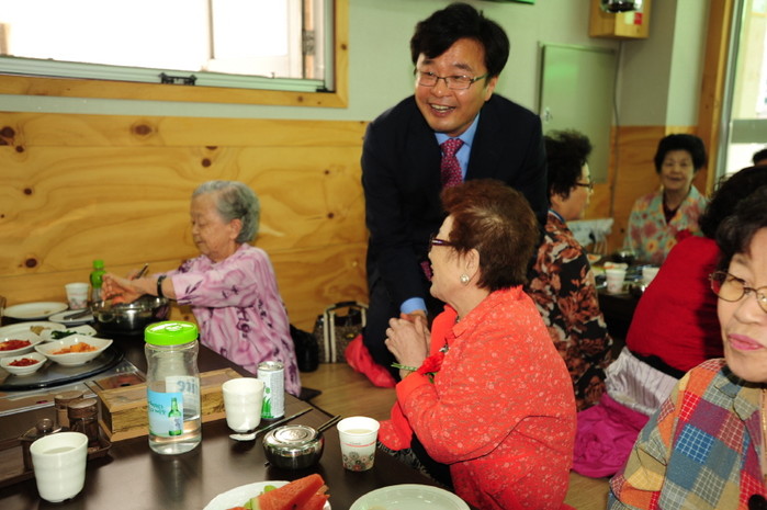최근 서울 은평구 역촌동 주민센터는 제44회 어버이날을 맞아 노인 200여명과 함께 지역내 음식점인 연서면옥에서 '어버이날 위안행사'를 개최했다. 사진은 김우영 구청장(가운데)이 노인들과 이야기를 나누는 모습.(사진제공=은평구청)
