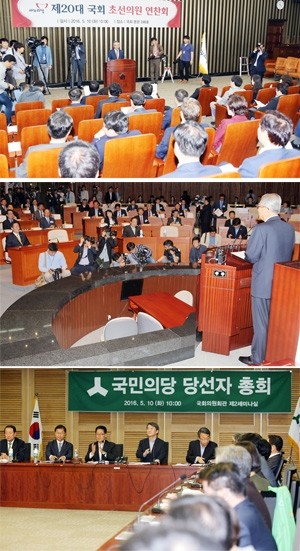새누리당 상임고문인 김형오 전 국회의장이 10일 오전 국회에서 열린 20대 국회 초선의원 연찬회에서 ‘제20대 국회의원이 가야 할 길’을 주제로 강연하고 있다(위). 더불어민주당 김종인 비상대책위 대표가 10일 오전 국회에서 열린 초선 당선인 워크숍에서 인사말을 하고 있다(가운데). 국민의당 지도부가 10일 오전 국회 의원회관에서 열린 당선자 총회에서 참석자들이 모두발언을 듣고 있다.