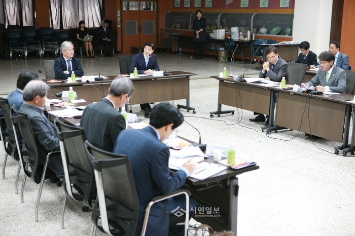 지난 9일 강동구는 구청 대강당에서 '제1차 서울 암사동 유적 세계유산 등재 추진위원회의'를 개최하고 ‘세계유산 등재 사업에 대한 현황과 계획’, ‘전시관 리모델링 현황’등에 대해 민간 전문가들 및 구청 직원과 의견을 나눴다. 사진은 이해식 구청장(오른쪽에서 세 번째)이 발언하는 모습.(사진제공=강동구청)