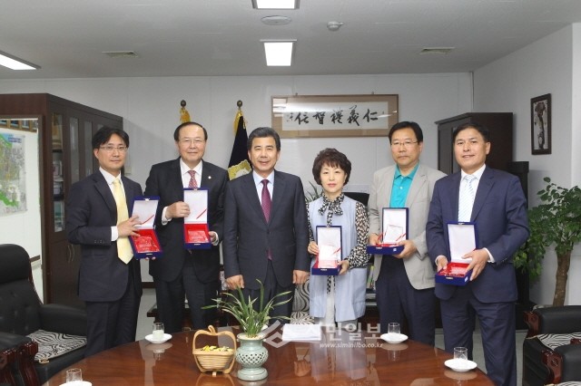 | ▲ 성임제 강동구의장(왼쪽에서 세번째)이 박재윤 강동구의원(왼쪽에서 두번째)을 비롯한 결산검사 위원들과 기념촬영을 하고 있다. | ||