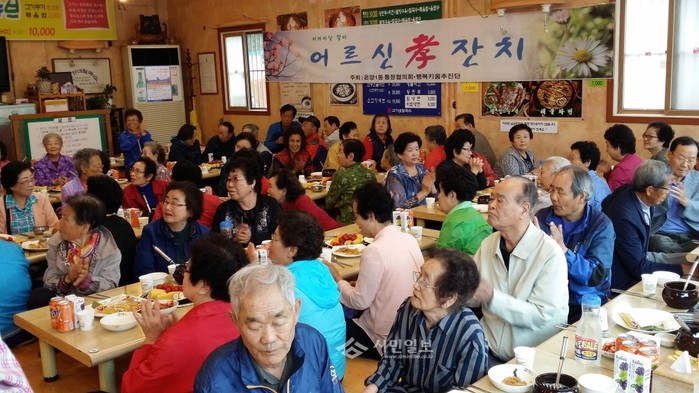 지난 10일 충남 아산시 온양1동 통장협의회와 행복키움추진단은 제44회 어버이날을 맞아 지역내 노인 80여명을 초대해 효 행사를 개최했다. 사진은 행사에 참석한 노인들이 공연을 관람하는 모습.(사진제공=아산시청)
