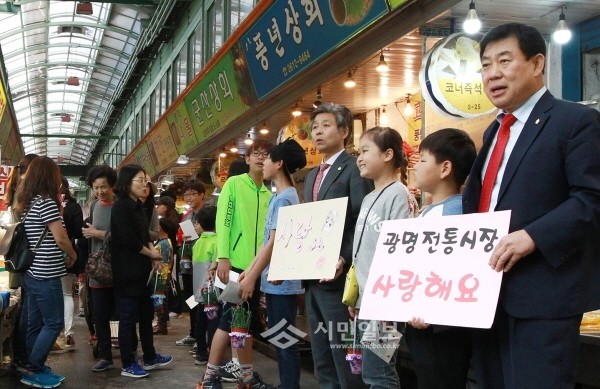 지난 11일 경기 광명전통시장에서 나상성 광명시의회 의장(오른쪽 네 번째)과 김기춘 의원(오른쪽 첫 번째), 광명초등학교 학생 등이 참석해 카네이션 꽃바구니를 상인들에게 전달하며 어린이에게 '효'의 전통을 전수하는 시간을 가졌다.(사진제공=광명시의회)