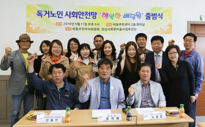 경기 안산시 와동이 지난 11일 홀몸노인에게 요구르트를 배달하며 안부확인을 하는 등 저소득층 홀몸노인의 사회안전망 구축을 위한 ‘행복한 배달원’의 출범식을 열었다. 사진은 출범식 후 행복한 배달원과 관계자들이 기념촬영을 하고 있는 모습.(사진제공=안산시청)