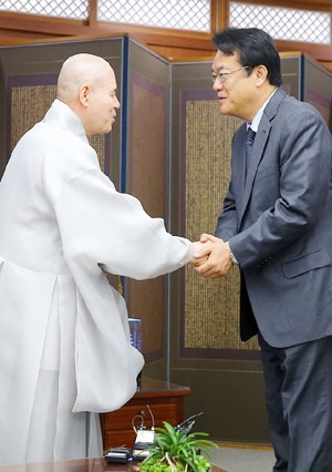 조계종 총무원장인 자승 스님이 12일 오전 서울 종로구 조계사를 예방한 새누리당 정진석 원내대표와 악수하고 있다.