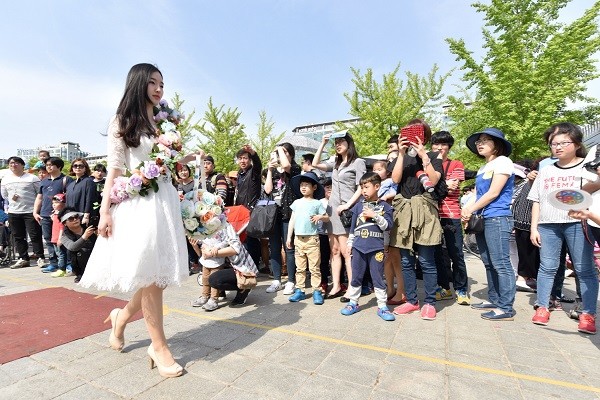 꽃으로 장식한 ‘웨딩 포토걸’은 플라워 퍼포먼스를 선보이며 관람객과 함께 기념촬영을 한다.