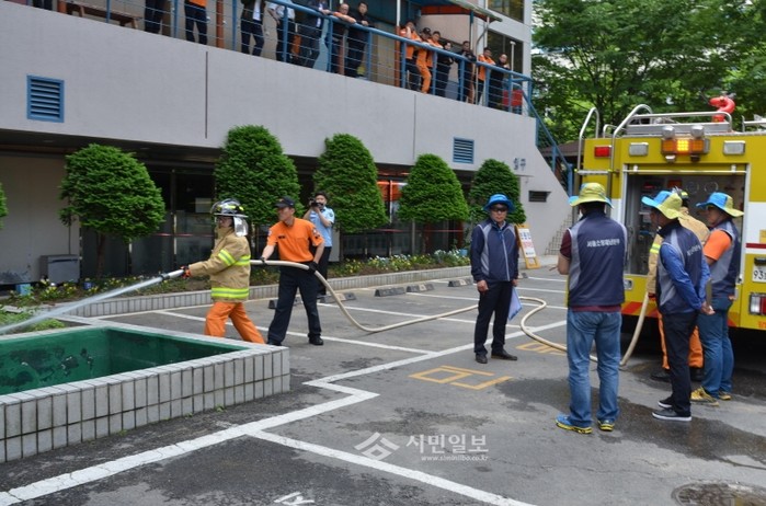 최근 강남소방서는 본서 차고 앞 등에서 특장소방차 운용능력에 대한 경연평가를 실시했다. 사진은 소방서 관계자들이 화학차를 운용하며 소방호스로 물을 뿌리는 모습.(사진제공=강남소방서)