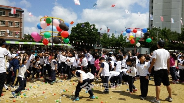 최근 경북 구미시 소재 원남초등학교는 학생들과 학부모, 지역 내빈 1500여명이 참여한 가운데 '원남 한마음 체육대회'를 개최했다. 사진은 참가 학생들이 풍선 터트리기 경기를 하는 모습.(사진제공=원남초등학교)