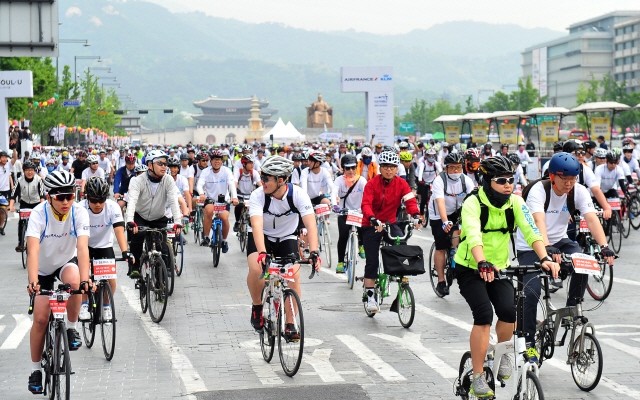 15일 오전 광화문 광장에서 '2016 Hi Seoul 자전거 대행진'이 열렸다. 참가자들이 결승선이 월드컵공원을 향해 출발하고 있다.